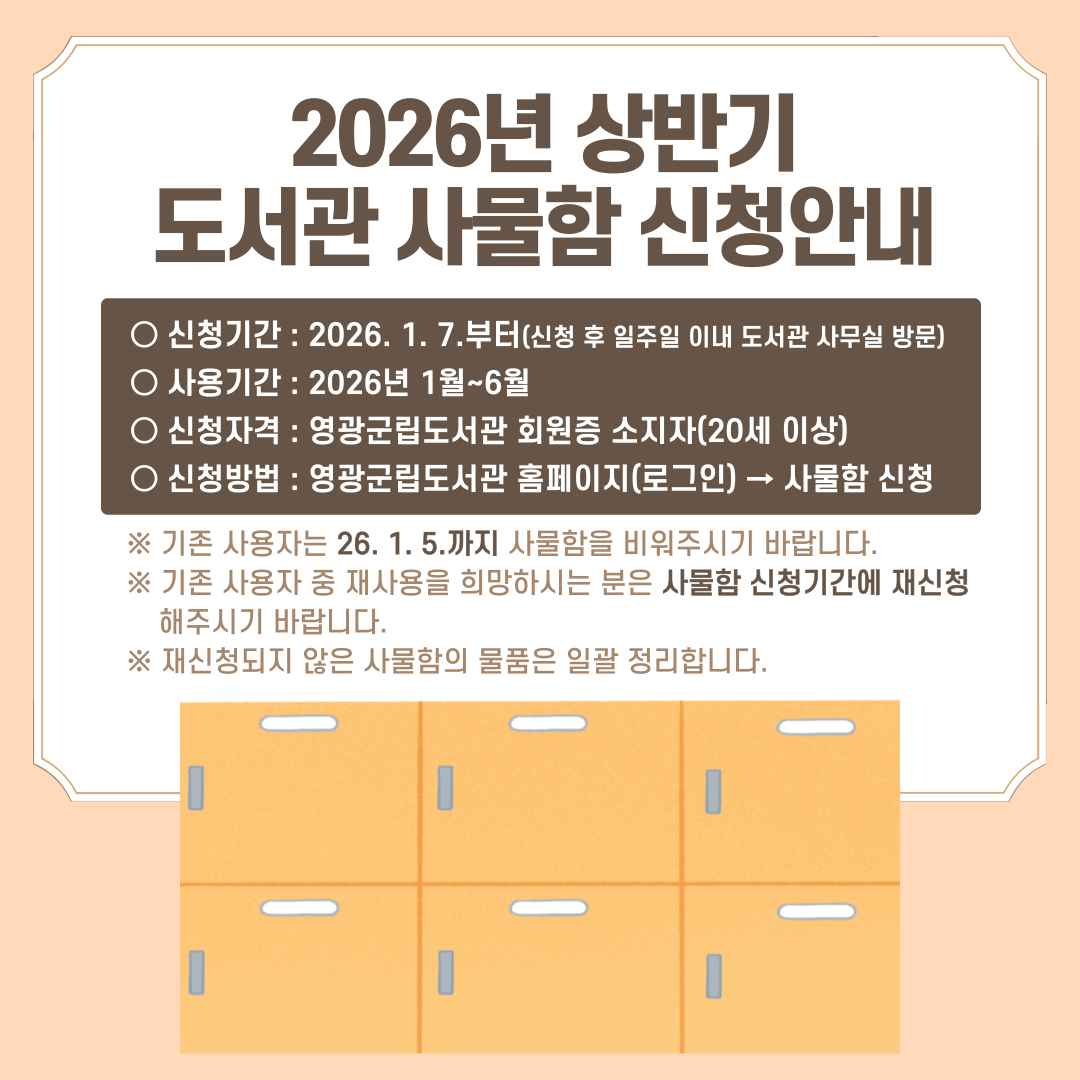 2026년 상반기(1~6월) 영광군립도서관 사물함 신청은 1월 7일부터 “사물함 신청” 메뉴에서 신청해주시기 바랍니다.