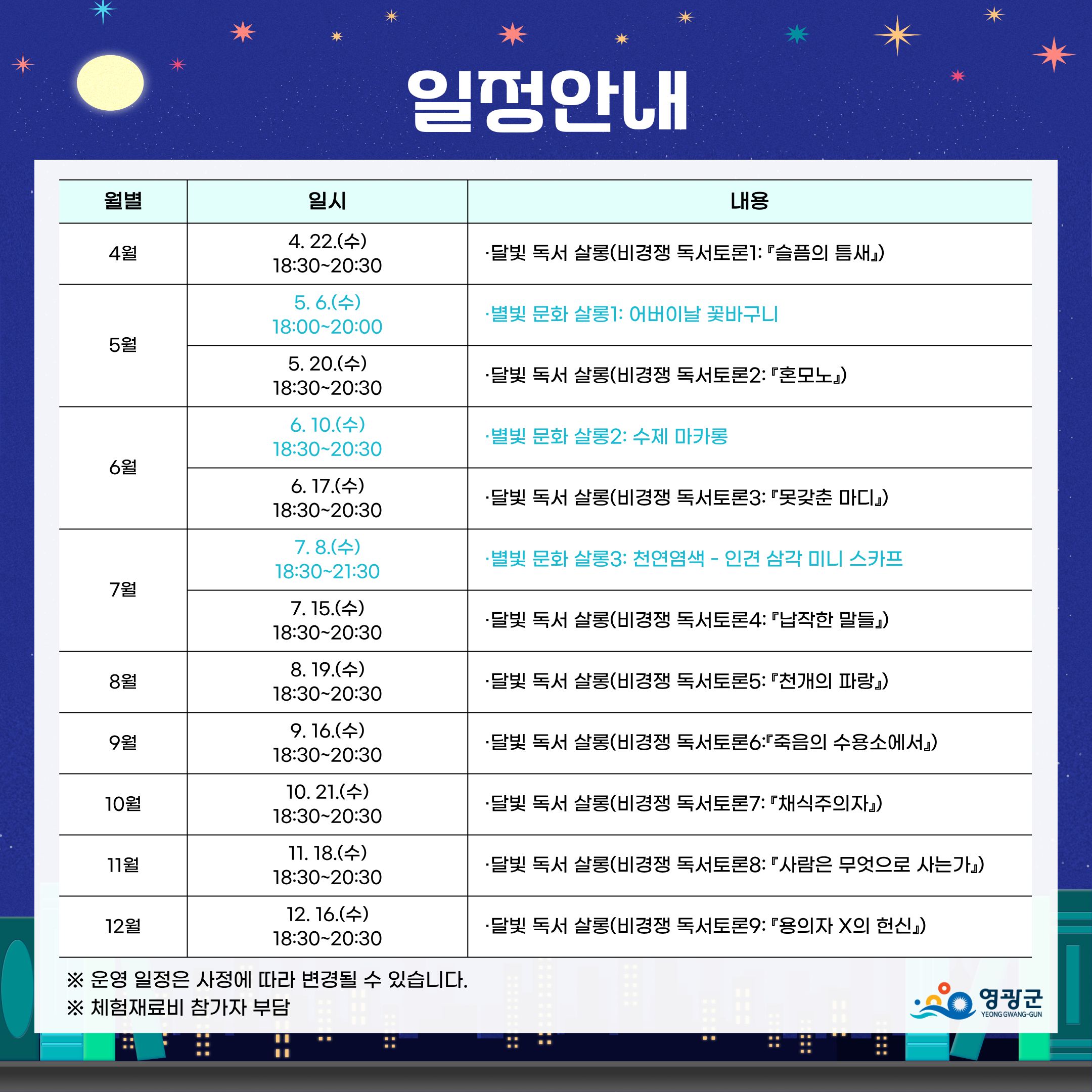 ※ 운영 일정은 사정에 따라 변경될 수 있습니다. (체험재료비 참가자 부담)