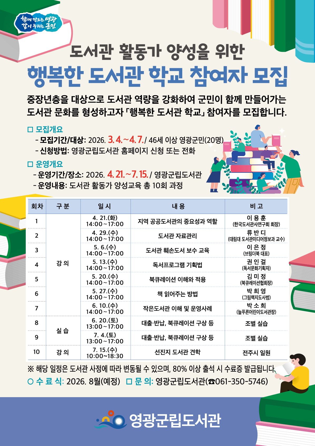 중장년층을 대상으로 도서관 역량을 강화하여 군민이 함께 만들어가는 도서관 문화를 형성하고자 「행복한 도서관 학교」 참여자를 모집합니다.