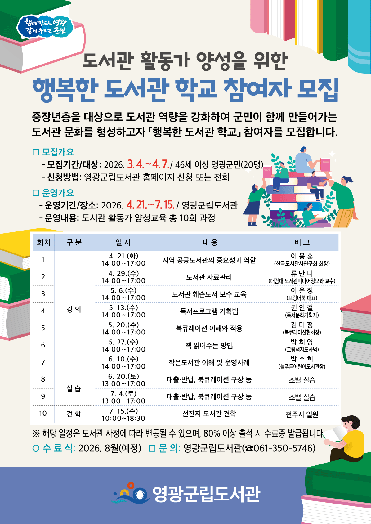 영광군립도서관에서 46세 이상 중장년층을 대상으로, 2026년 3월 4일부터 「행복한 도서관 학교」 참여자를 모집하오니, 많은 신청 바랍니다!